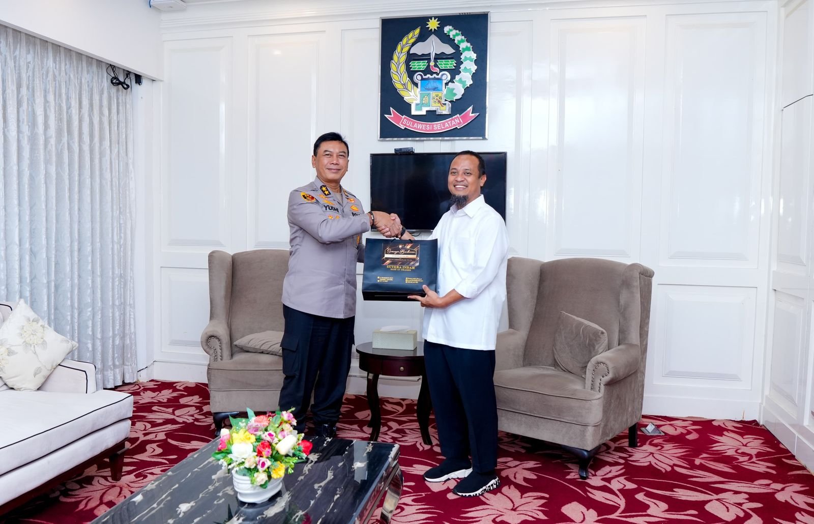 Kunjungan Kapolda Sulsel, Irjen Pol Yudhiawan didampingi Kapolrestabes Makassar, Kombes Pol Arya dan PJU. Kunjungan Irjen Pol Yudhiawan tersebut selain silaturahmi sekaligus pamit sebagai Kapolda Sulsel ke Gubernur Sulsel, Andi Sudirman Sulaiman.